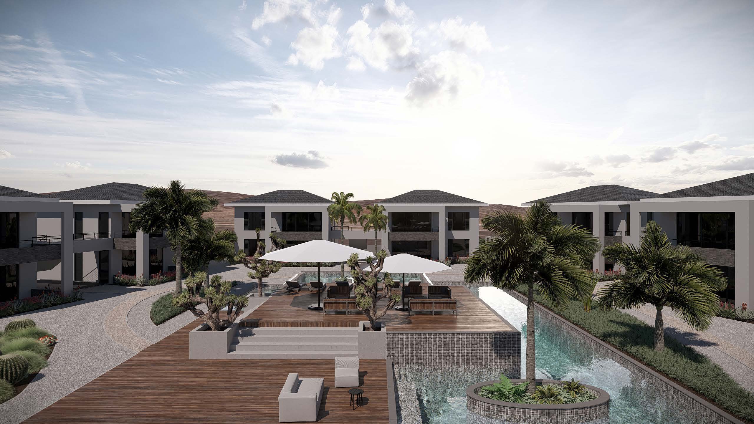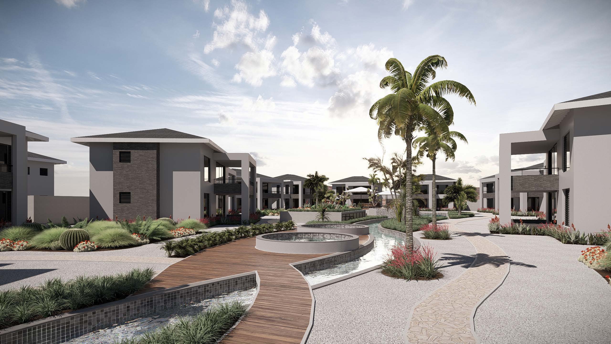De architectuur ademt Caribische sereniteit: lichte tinten, organische lijnen en een verfijnde balans tussen binnen en buiten. Elk appartement – met twee slaapkamers, twee badkamers en een luxe keuken – is ontworpen volgens Europese kwaliteitsstandaarden en biedt uitzicht op de natuur, de baai of de iconische Tafelberg aan de horizon.